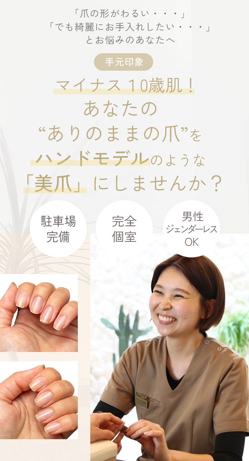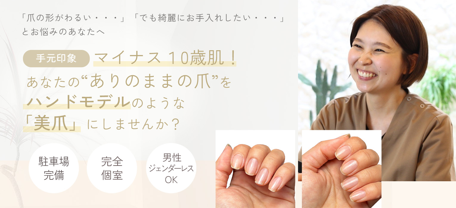 ジェルやアクリルを使わず、あなたのありのままの爪を綺麗な爪に整えてまいります。